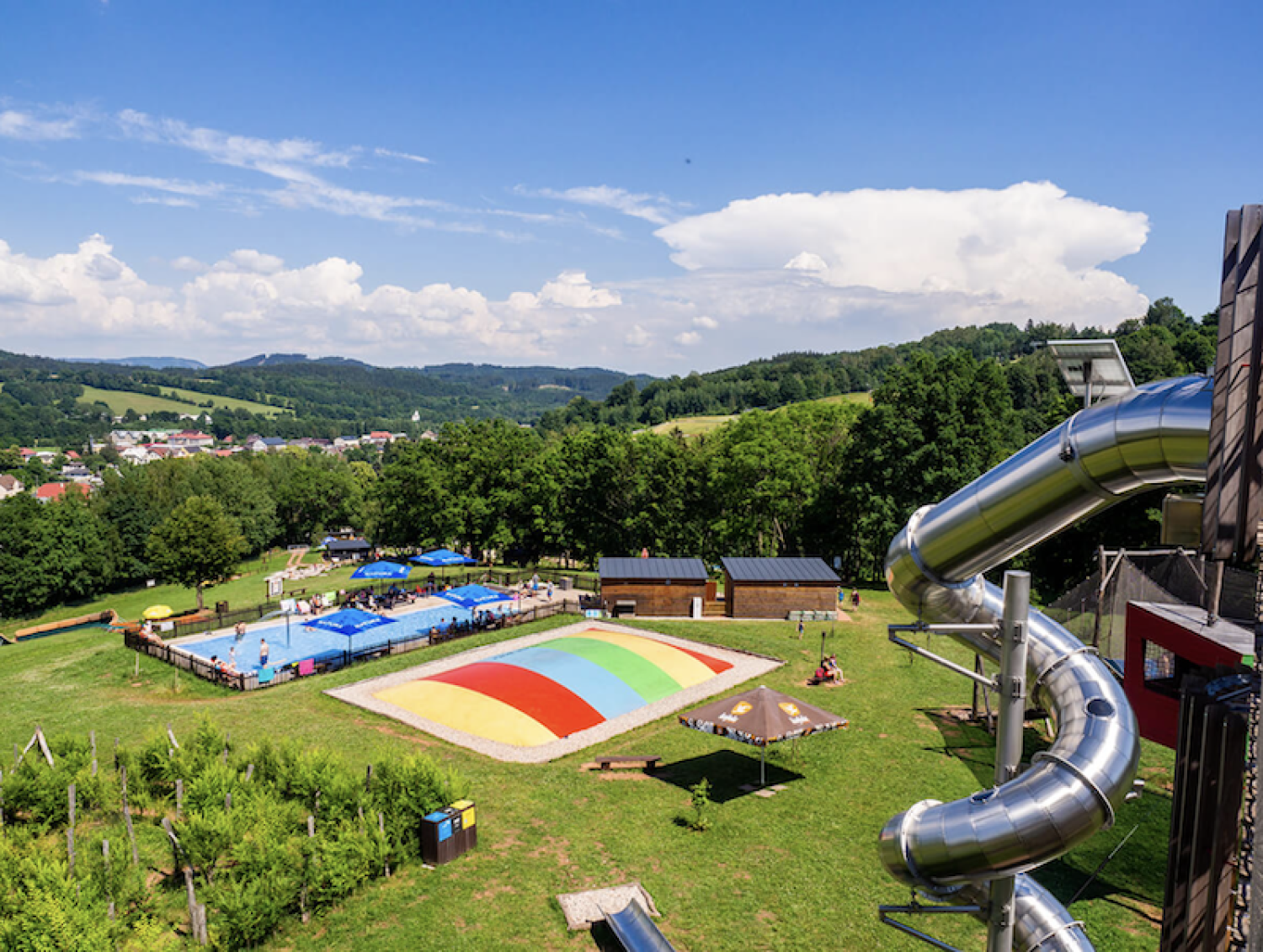 Velký letní areál pro děti s vodním světem, trampolínami a 3D bludištěm s obří klouzačkou.